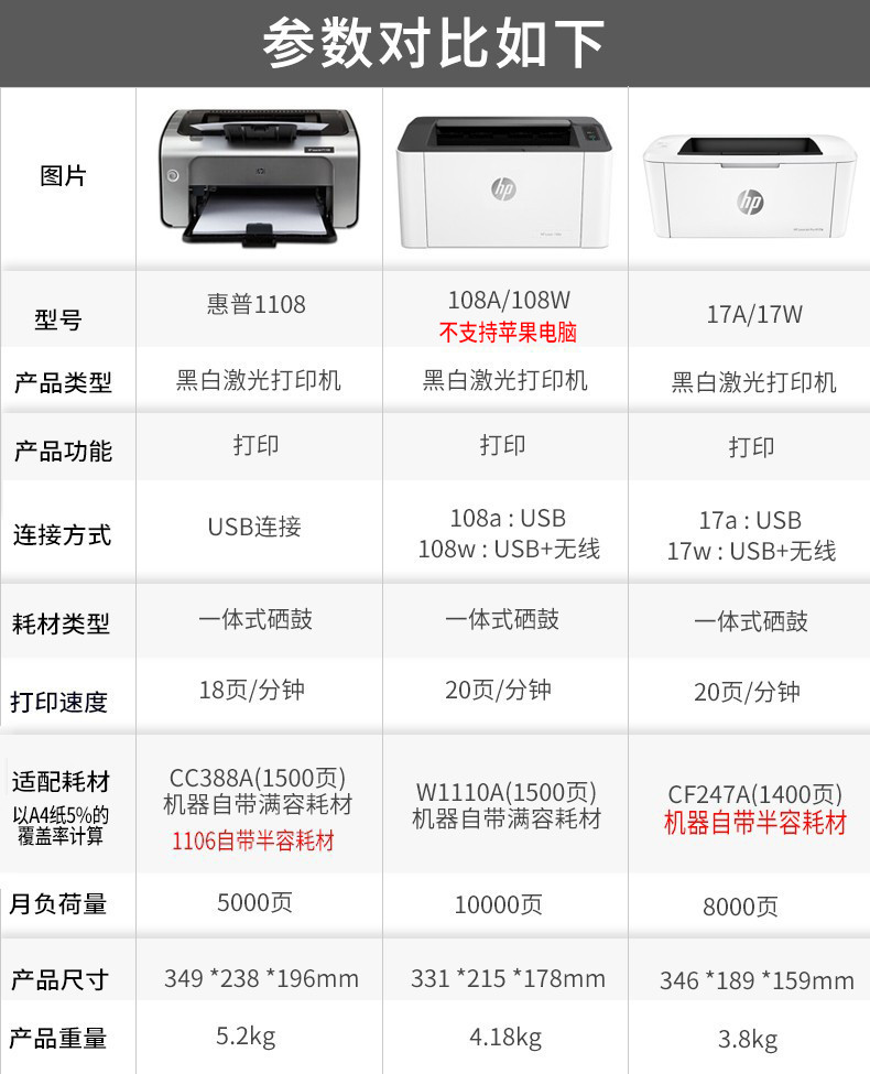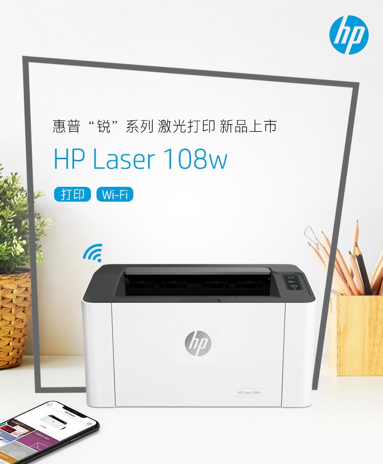 惠普(HP)1108/17w/108w/108a/104a A4黑白激光打印机家用小型办公同1020 108w(1108升级版无线+满容耗材)